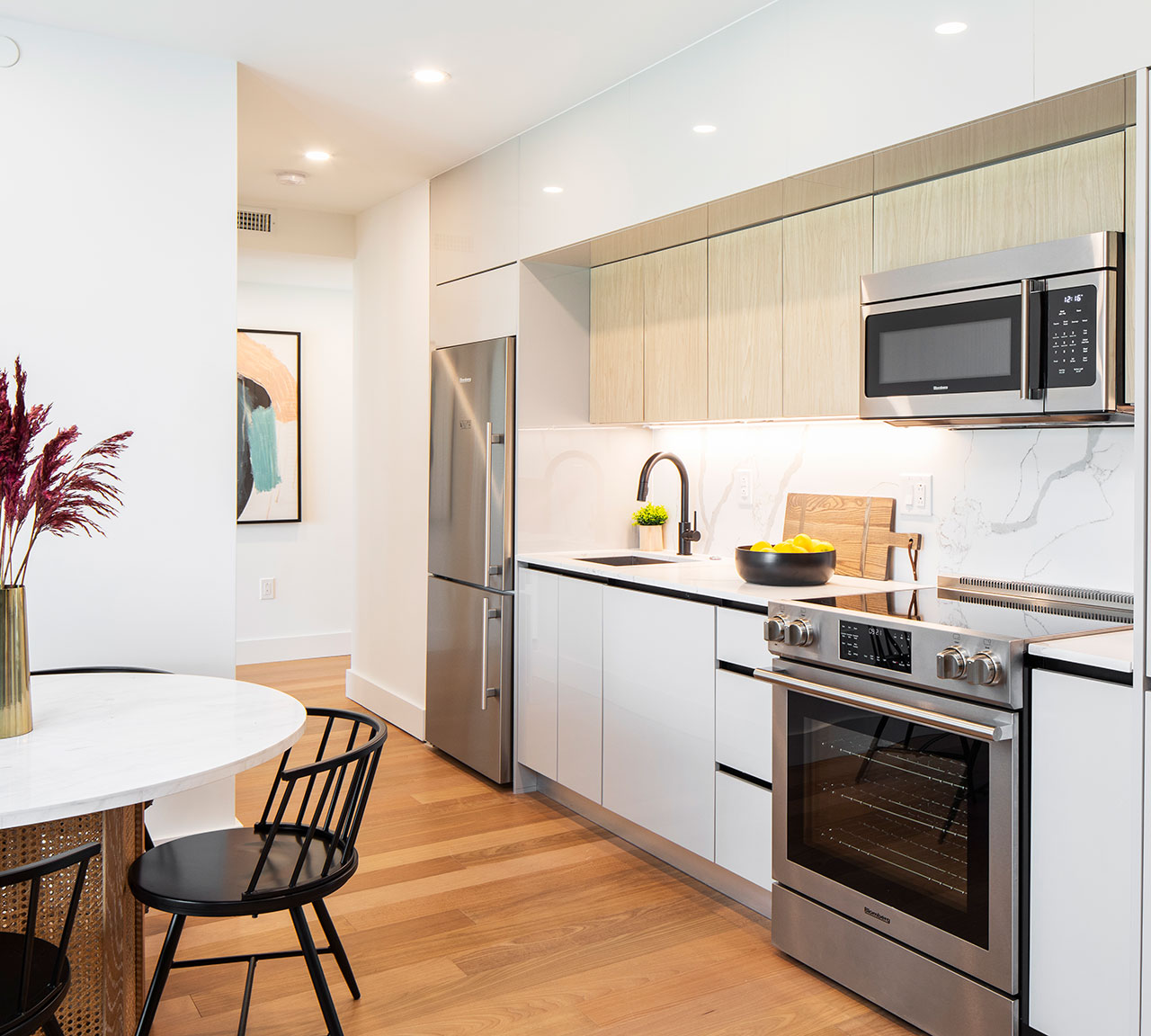 Bold bright design is inherent in these newly renovated residences. The Palazzo apartments offer a generous array of enhanced features including Brazilian Oak hardwood floors, upgraded appliances and private balcony. Each sophisticated kitchen includes Quartz countertops with waterfall edges and a solid backsplash, set against top of the line appliances and integrated lighting.
